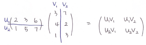 첫번째 행렬의 행을 각각 $u_1$과 $u_2$, 두번째 행렬의 열을 각각 $v_1$과 $v_2$로 작성해놓고 모양을 만들어놓는다.