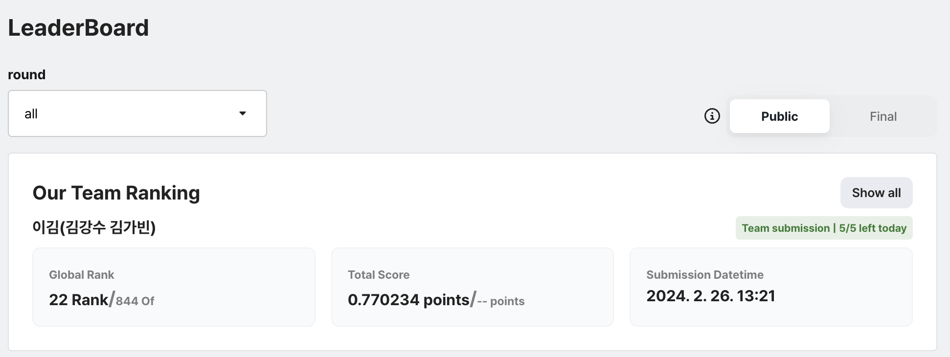 test 데이터셋에서도 강건한 모델을 만들기 위해 노력해야 함을 절실히 깨달았다. 다음에 기회가 있다면 이 부분에 더 집중해야겠다.