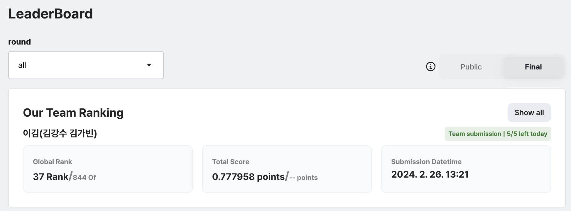 사실 종료 직전에 Public 등수가 항상 10위권이던 팀이 Public Score 리더보드 40위권으로 떨어져 있는 것을 보았다. 해당 팀은 대회 내내 상위권을 차지하고 있었기 때문에 더욱 의문스러웠다. 제출이 완료되고 Private Score 점수를 확인해 보니 그 이유를 알 수 있었다. 그 팀이 Private 리더보드 10위권에 위치해 있었다. Private Score를 높이기 위한 전략이 있었던 것 같다. 어떻게 그렇게 Robust한 모델을 만들었는지 아직도 의문이다. 메일 보내서 여쭙고 싶을 정도..